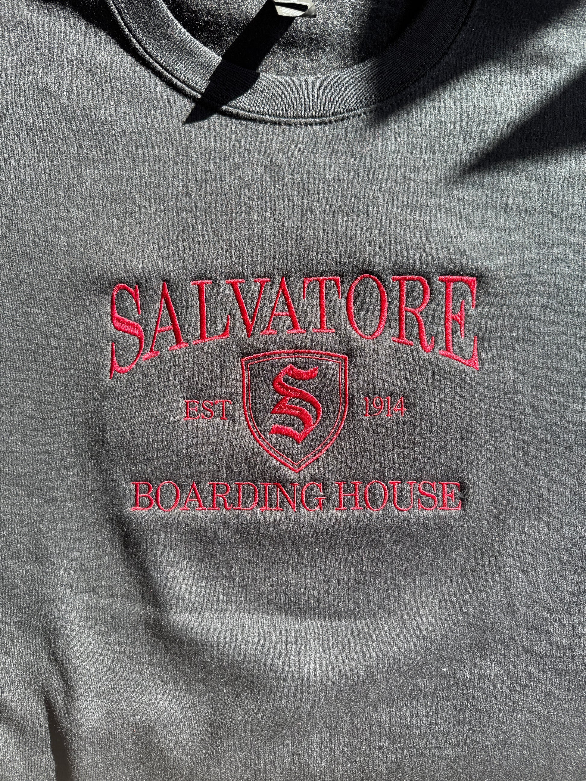 embroidered on black crewneck